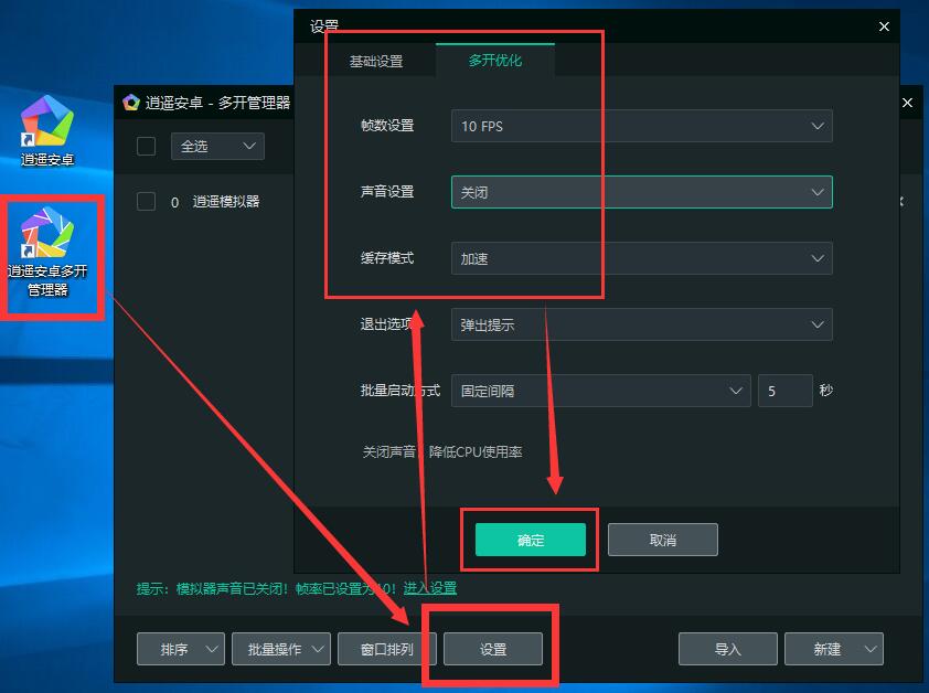 3、点击多开管理器底下的“设置”——“多开优化”,帧数设置“10 FPS”,声音设置“关闭”,最后点“确定”按钮。
